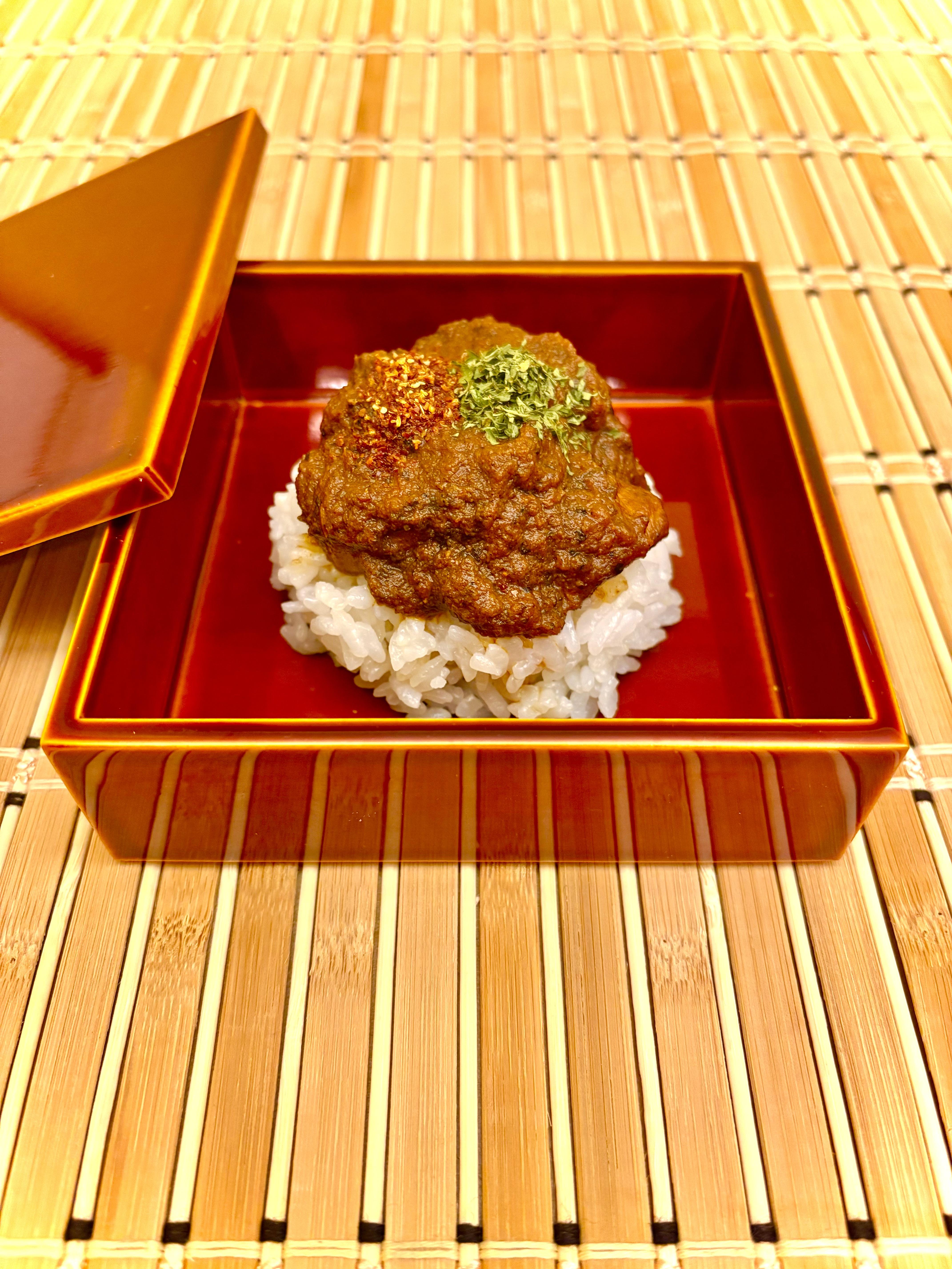 全国の銘柄鶏の中から選び抜いた「伊達鶏」のむね肉を使用し、スパイスの輪郭を際立たせました。直線的・広がる・強烈——異なる辛味を持つ数種類の唐辛子を厳選し、緻密に配合したスパイスミックスが、真の辛口を生み出します。仕上げには数種のハーブを加え、ただ辛いだけではない、旨味と爽快感が共存する辛口カレーです。